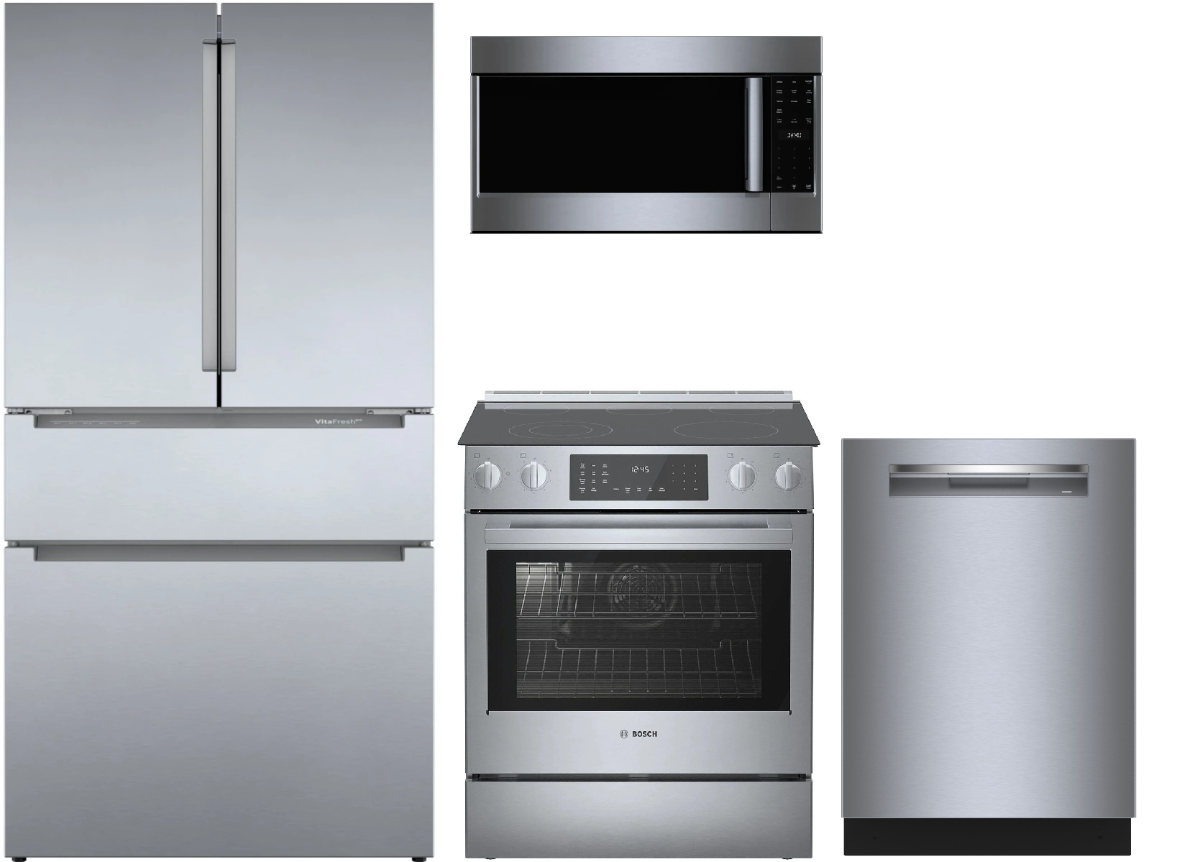 Request More InfoBosch® 800 Series 36 in. 20.5 Cu. Ft. Stainless Steel Counter Depth French Door Refrigerator, Bosch® 800 Series 30" Stainless Steel Slide In Electric Range, Bosch® 800 Series 24" Stainless Steel Top Control Built In Dishwasher, and Bosch® 500 Series 2.1 Cu. Ft. Stainless Steel Over the Range Microwave Read More