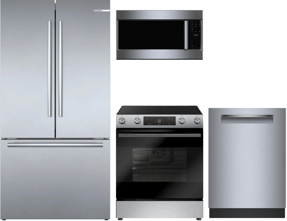 Request More InfoBosch® 800 Series 36 in. 20.8 Cu. Ft. Stainless Steel Counter Depth French Door Refrigerator, Bosch 100 Series 30" Stainless Steel Slide In Electric Range, Bosch® 500 Series 24" Stainless Steel Top Control Built In Dishwasher, and Bosch® 500 Series 2.1 Cu. Ft. Stainless Steel Over the Range Microwave Read More