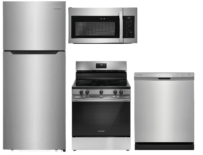 Request More InfoFrigidaire® 4 Piece Stainless Steel Kitchen Package with top freezer refrigerator, freestanding electric range, built in dishwasher and over the range microwave. Read More