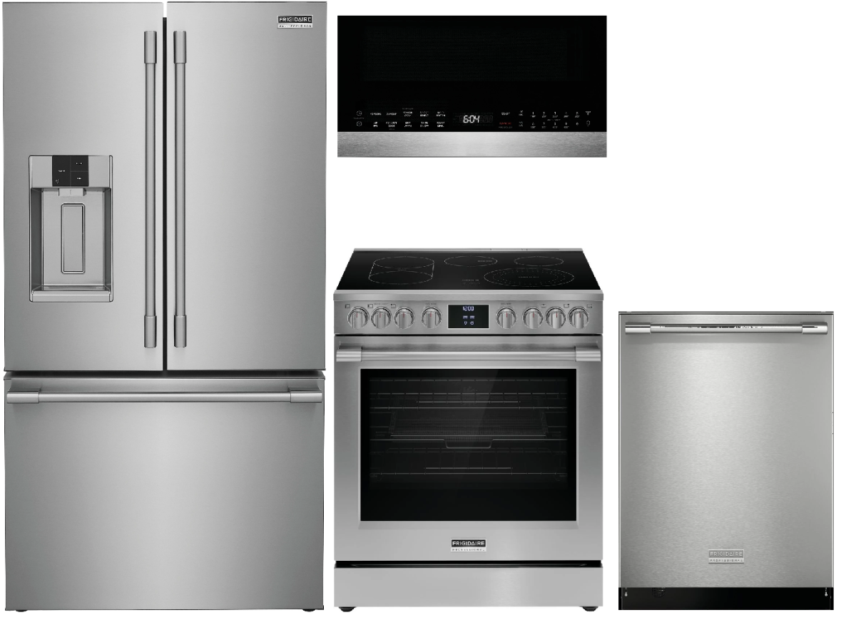Request More InfoFrigidaire Professional® 4 Piece Stainless Steel Kitchen Package with French door refrigerator, free standing electric range, built in dishwasher and over the range microwave. Read More