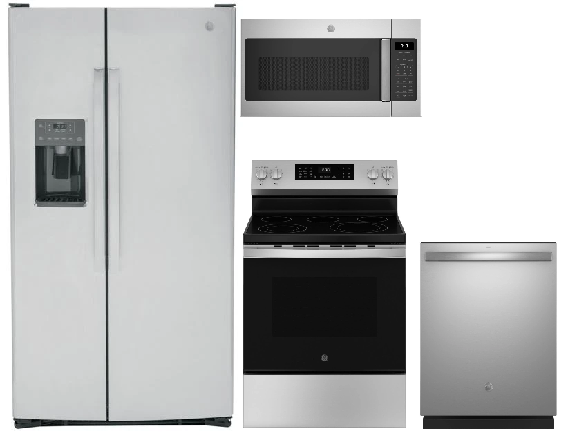 Request More InfoGE® 4 Piece Stainless Steel Kitchen Package with a side-by-side refrigerator, free standing electric range, built-in dishwasher and over the range microwave Read More