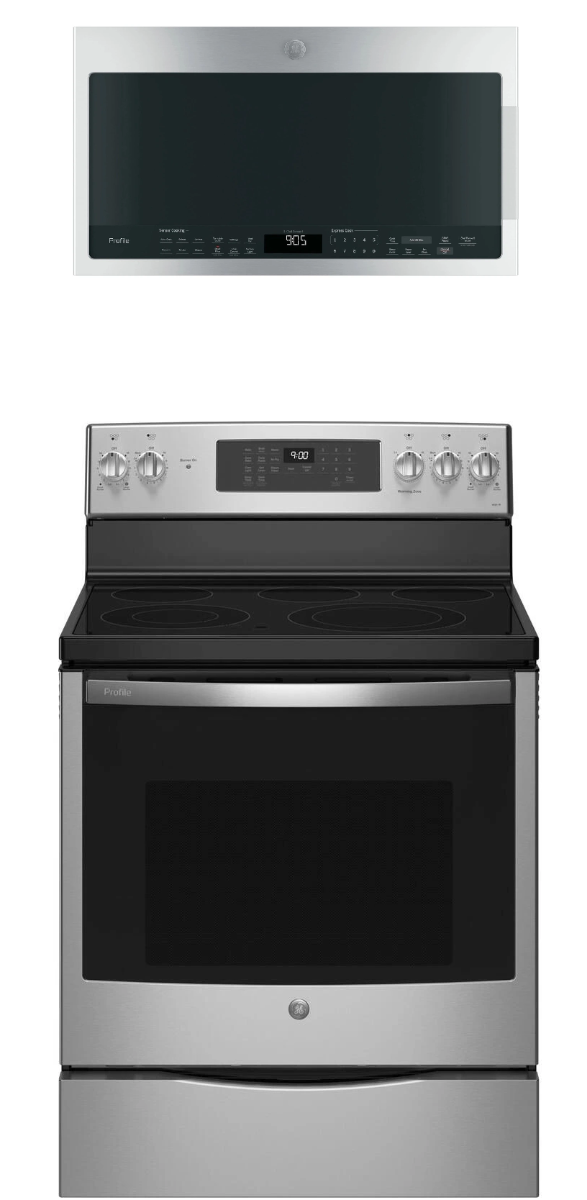 Request More InfoGE Profile™ 2 Piece Stainless Steel Kitchen Package with a freestanding electric range and over the range microwave. Read More