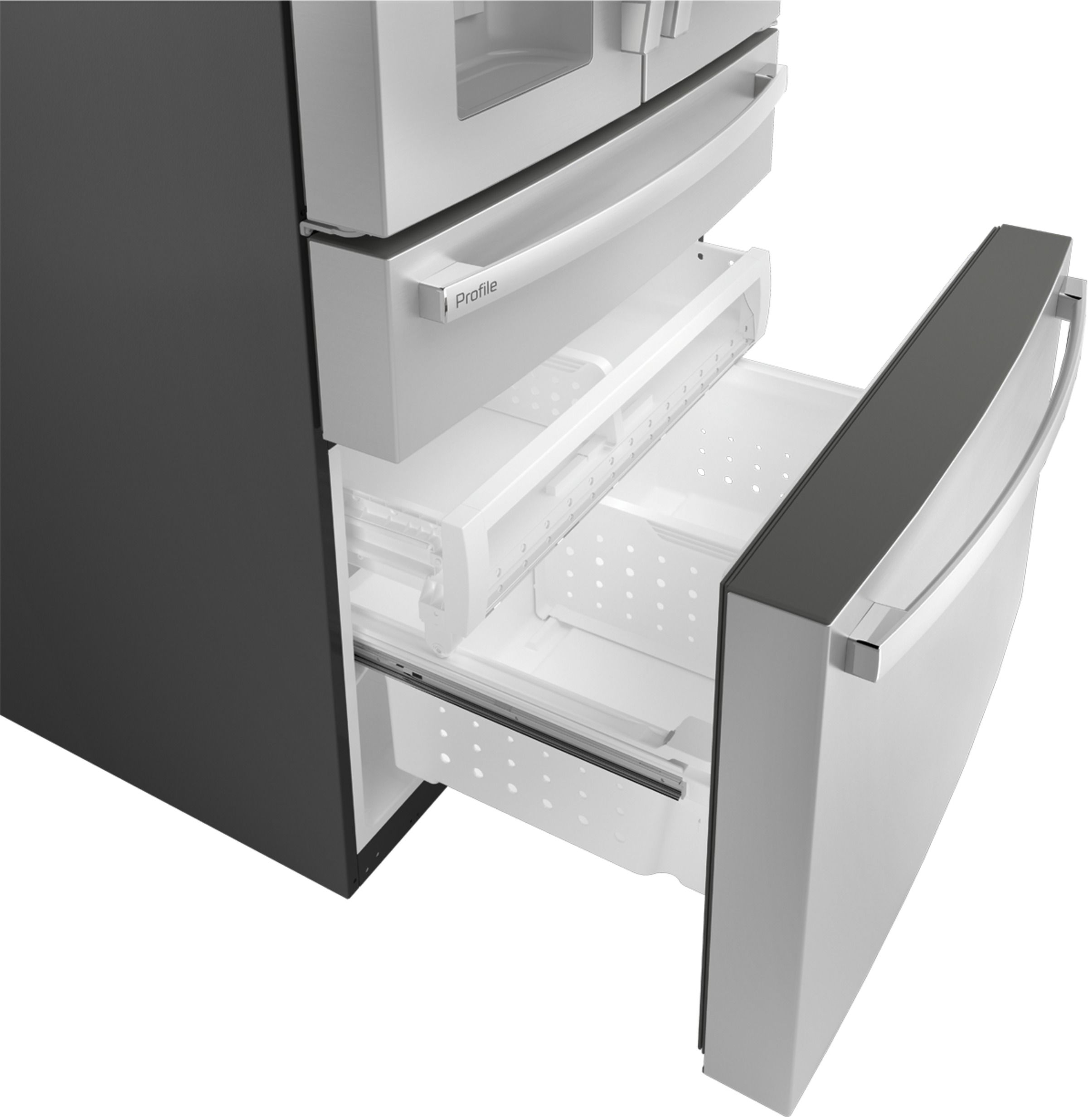 This GE Profile™ 4-french-door refrigerator with door in door features an adjustable temperature drawer with bin caddy, built-in Wi-Fi, LED light wall, soft-close drawers and hands-free autofill dispenser.