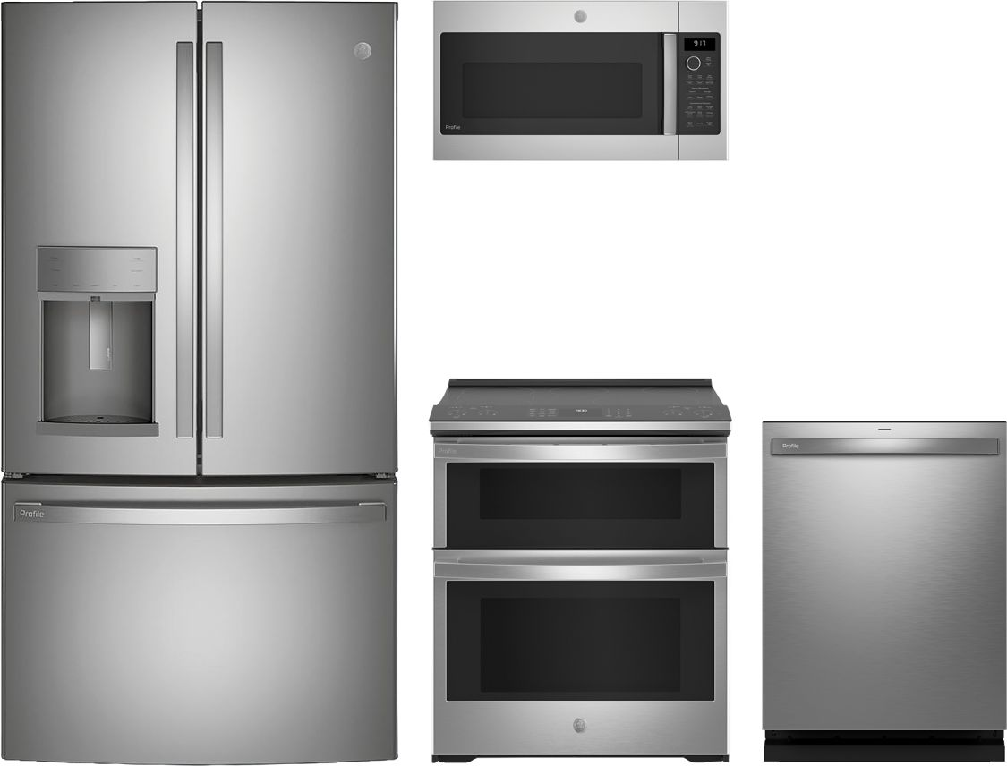 GE Profile™ 4 Piece Stainless Steel Kitchen Package with a French door refrigerator, slide-in electric range, built in dishwasher and over the range microwave. Read More
