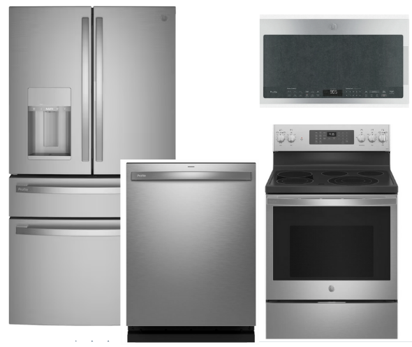 Request More InfoGE Profile™ 4 Piece Stainless Steel Kitchen Package with a french door refrigerator, free standing electric range, built in dishwasher and over the range microwave Read More