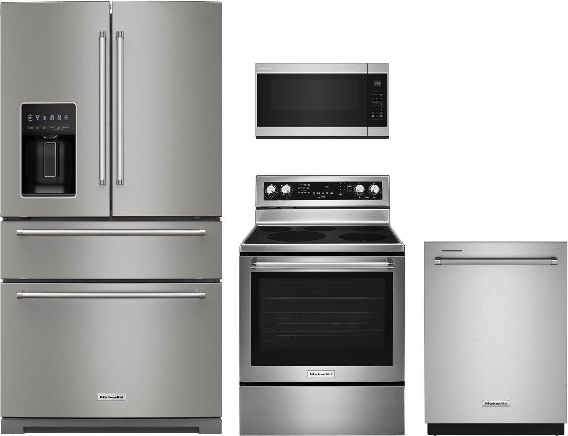 Request More InfoKitchenAid® 4 Piece Stainless Steel Kitchen Package with a french door refrigerator, free standing electric range, over the range microwave and built in dishwasher. Read More