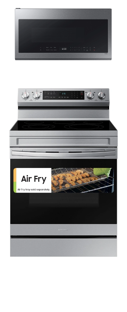 Request More InfoSamsung 2 Piece Stainless Steel Kitchen Package with freestanding electric range and over the range microwave. Read More