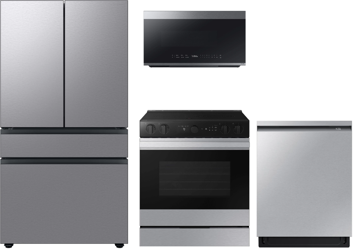 Request More InfoSamsung Bespoke 36 In. 22.8 Cu. Ft. Stainless Steel French Door Refrigerator, Samsung Bespoke 30" Stainless Steel Slide In Electric Range, Samsung 24" Fingerprint Resistant Stainless Steel Built In Dishwasher, and Samsung Bespoke 2.1 Cu. Ft. Fingerprint Resistant Stainless Steel Over The Range Microwave Read More