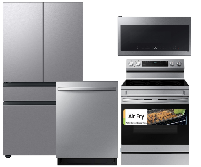 Request More InfoSamsung 4-Piece Kitchen Package in Stainless Steel with French Door Refrigerator, slide-in electric range, built-in dishwasher, and over-the-range microwave. Read More