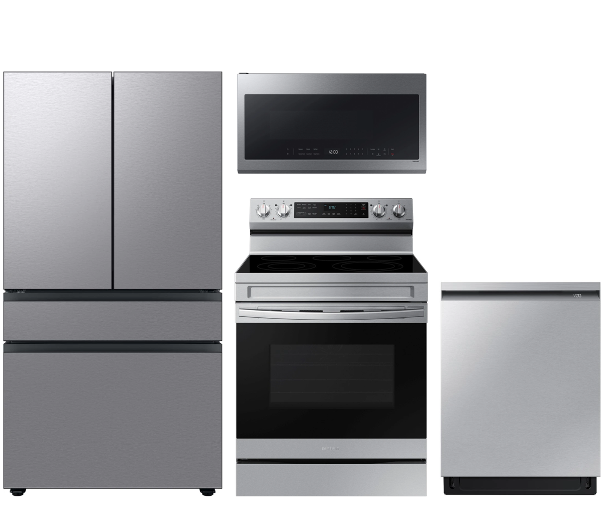 Request More InfoSamsung 4-Piece Kitchen Package in Stainless Steel with French Door Refrigerator, slide-in electric range, built-in dishwasher, and over-the-range microwave. Read More