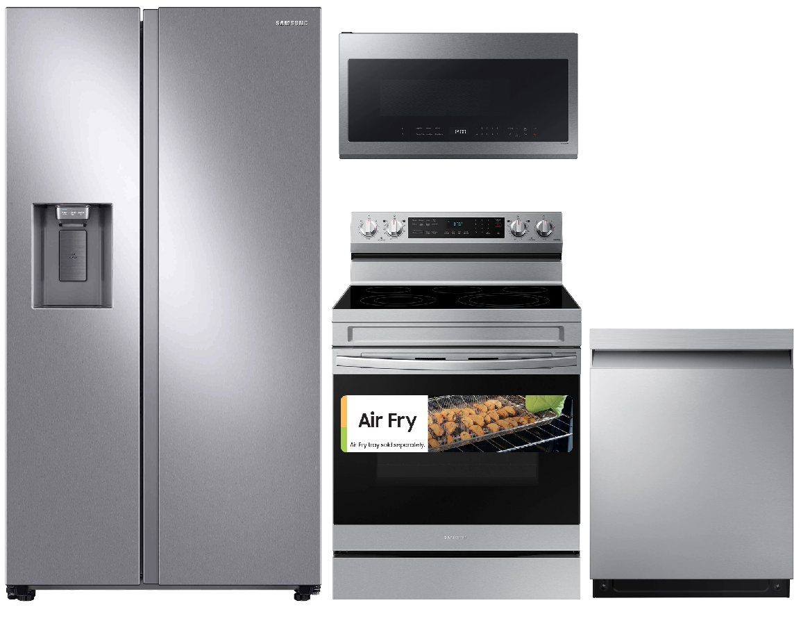 Request More InfoSamsung 4 Piece Stainless Steel Kitchen Package with side-by-side refrigerator, freestanding electric range, built in dishwasher and over the range microwave. Read More