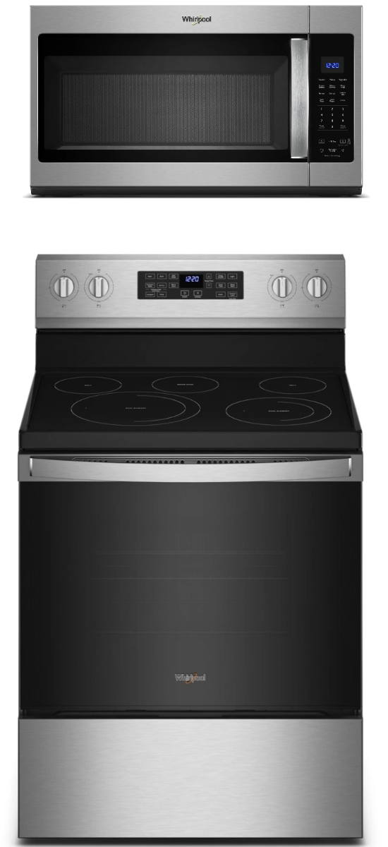 Request More InfoWhirlpool® 2 Piece Fingerprint Resistant Stainless Steel Kitchen Package with a free standing electric range and over the range microwave. Read More