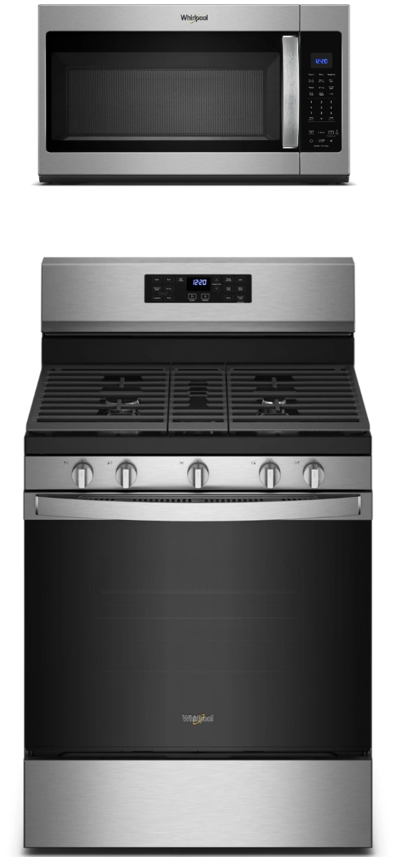 Request More InfoWhirlpool® 2 Piece Fingerprint Resistant Stainless Steel Kitchen Package with a free standing gas range and over the range microwave. Read More