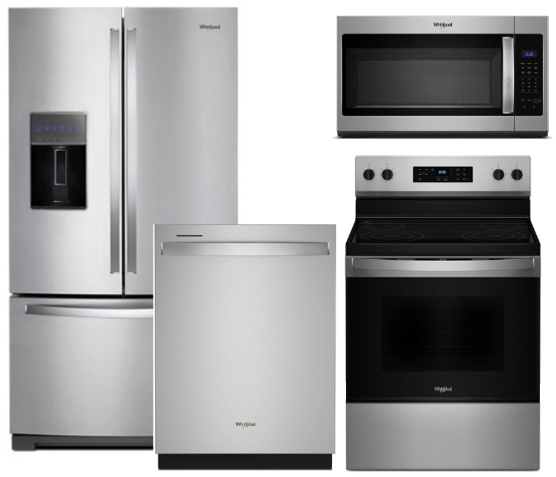 Request More InfoWhirlpool® 4 Piece Stainless Steel Kitchen Package with French Door Refrigerator, Free Standing Electric Range, Built In Dishwasher, and Over The Range Microwave. Read More