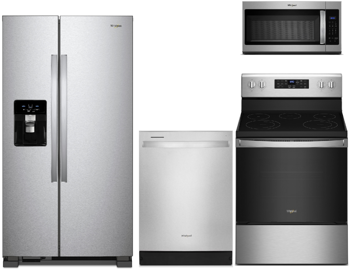 Request More InfoWhirlpool® 4 Piece Stainless Steel Kitchen Package with Standard Depth Side-by-Side Refrigerator, Free Standing Electric Range, Built In Dishwasher, and Over The Range Microwave. Read More